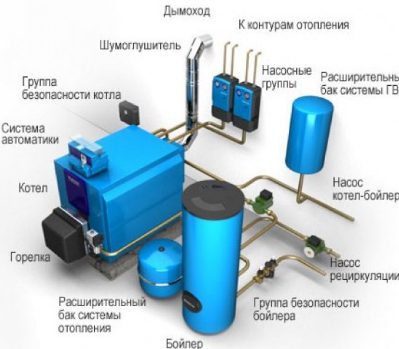 - Выше первоначальная стоимость (котёл + бойлер + насос + арматура);